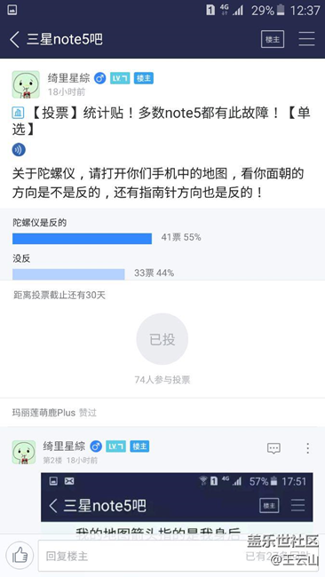 Note5 指南針嚴(yán)重不準(zhǔn),蘋果6s和note5 同時打開地圖,note 5一直都是亂指,6s正確,有圖片,兩臺手機同時指向南面,note5 是反的,按照網(wǎng)友說法是沒校準(zhǔn),拿起手機在空中畫8字,還是指向不對。在百度貼吧發(fā)起投票發(fā)現(xiàn)大多數(shù)都存在如此問題,是軟件問題還是硬件故障?希望能夠修復(fù)?!緢D片】【圖片】【圖片】