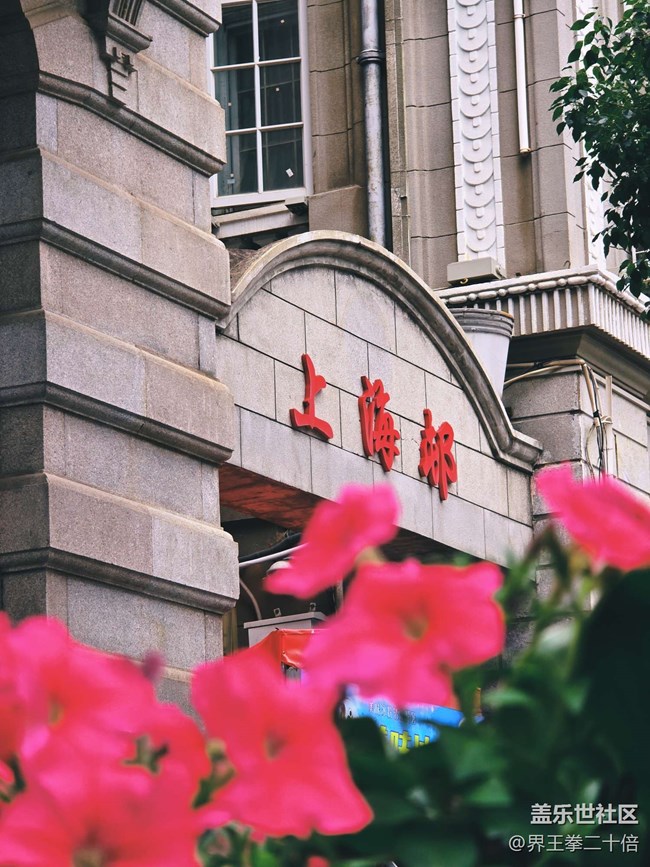 通過(guò)長(zhǎng)焦的角度來(lái)拍攝花朵和上海邨的牌匾