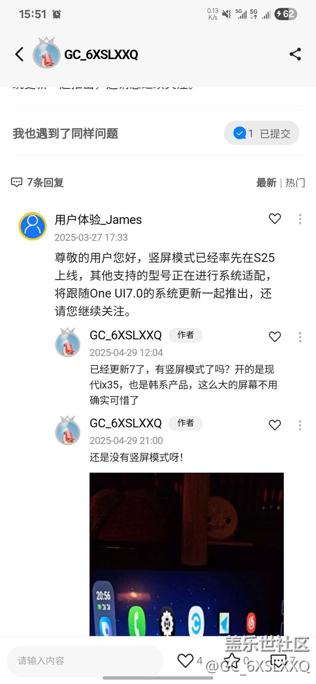 之前反饋過(guò)三星車(chē)聯(lián)關(guān)于比例失調(diào)的問(wèn)題,給的答復(fù)是會(huì)隨系統(tǒng)更新增加新適配,滿(mǎn)心期待。結(jié)果更新之后并沒(méi)有,再次反饋,給的答復(fù)反而變成了什么carlife+協(xié)議不支持豎屏模式?拜托,研發(fā)做不好,抄作業(yè)也不會(huì)?你們看看vivo,看看小米,我的截圖里就是小米手機(jī)的界面,那么大的carlife+,夠明顯吧?那么大的幾個(gè)字,豎屏模式,能看清嗎?你們拿現(xiàn)成的過(guò)來(lái)抄一下也行啊,非要來(lái)一句協(xié)議不支持,真是夠搞笑的。那它不支持,別人是怎么做出來(lái)的?你就算說(shuō)一句,正在反饋研究,那都可以!可以等一等。真的是對(duì)這個(gè)事情挺無(wú)語(yǔ)的!你不好好搞本土化也就算了,自家韓系的車(chē)機(jī)也做不好適配,還用一些匪夷所思的借口來(lái)搪塞。我也算老用戶(hù)了,東西是好東西確實(shí)不假,品質(zhì)什么的也是安卓頂尖。但是這次真的是越來(lái)越發(fā)覺(jué)你們這個(gè)敷衍的處理態(tài)度,不怪別人總黑你們。自生自滅吧……