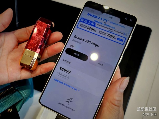 無(wú)論是側(cè)面比較他們的薄厚,還是拿在手里感覺(jué)重量,三星s25edge都要更輕薄,重量上我個(gè)人感覺(jué)相差不大。我平時(shí)包里還會(huì)背一只口紅,我把它也拿出來(lái)與手機(jī)進(jìn)行對(duì)比。可以看到手機(jī)非常的輕薄。