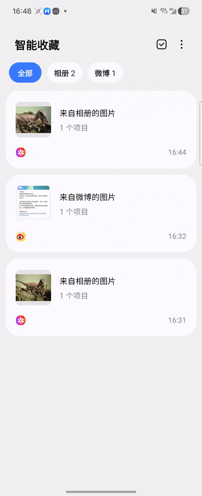 內(nèi)容就已經(jīng)被妥善地存入了“智能收藏”里。它還會(huì)自動(dòng)根據(jù)內(nèi)容的來源進(jìn)行分類,幫你整理得井井有條,找起來非常方便。