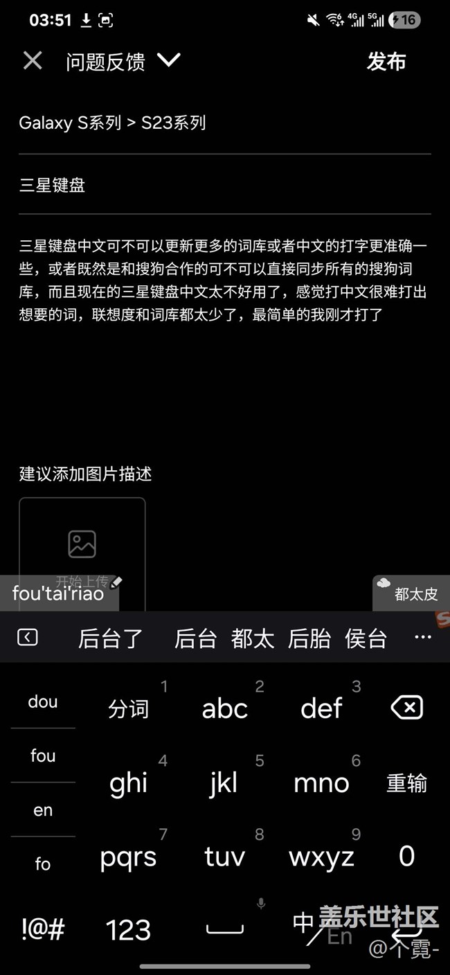 三星鍵盤中文可不可以更新更多的詞庫或者中文的打字更準(zhǔn)確一些,或者既然是和搜狗合作的可不可以直接同步所有的搜狗詞庫,而且現(xiàn)在的三星鍵盤中文太不好用了,感覺打中文很難打出想要的詞,聯(lián)想度和詞庫都太少了,最簡(jiǎn)單的我剛才打了都太少三個(gè)字都想不到出現(xiàn)的詞如下圖,不知道是什么原因,反正希望把中文輸入法再深度優(yōu)化一下