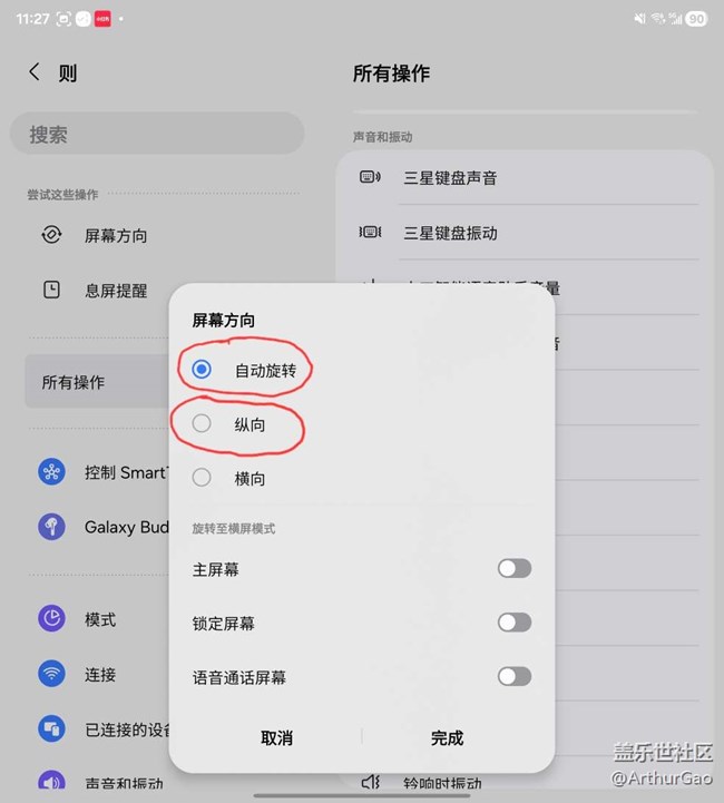 相信使用zfold系列折疊屏的朋友都會(huì)發(fā)現(xiàn),若一直開(kāi)啟自動(dòng)旋轉(zhuǎn),使用長(zhǎng)條形的外屏?xí)r,屏幕內(nèi)容會(huì)在不想旋轉(zhuǎn)的時(shí)候被旋轉(zhuǎn)變形,而若是不開(kāi),當(dāng)展開(kāi)內(nèi)屏看視頻或者游戲時(shí)就無(wú)法轉(zhuǎn)換為更舒服的橫向握持,所以就需要從模式和日常任務(wù)里,設(shè)置一下當(dāng)屏幕完全打開(kāi)時(shí),自動(dòng)開(kāi)啟自動(dòng)旋轉(zhuǎn)功能(相應(yīng)的,也可以再加一個(gè)當(dāng)屏幕完全合上時(shí),自動(dòng)關(guān)閉之)