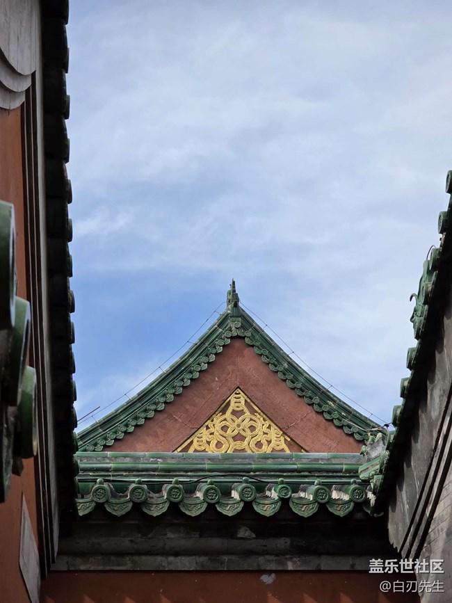 (使用S25 ultra三倍模式,等效69毫米焦距三倍長(zhǎng)焦鏡頭拍攝,藍(lán)天被圍墻框定,特寫中心的屋脊和博風(fēng)板)
