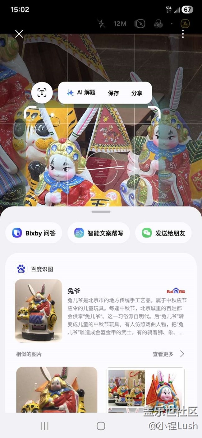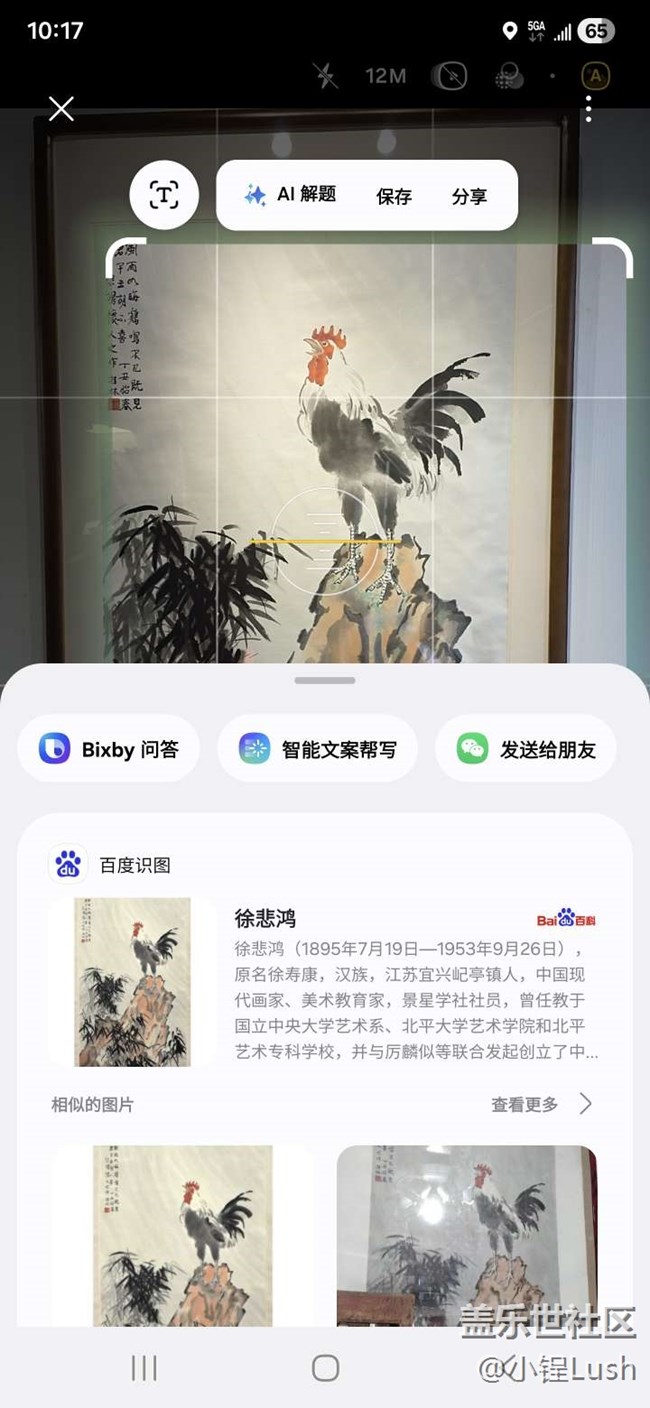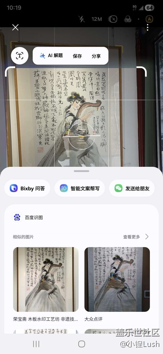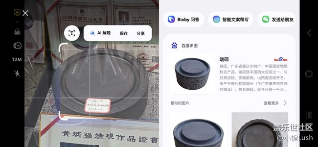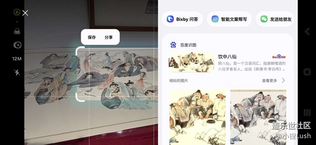 ?? 一組是使用三星手機(jī)“即圈即搜”功能時(shí)的展示照片,比如對(duì)一些水墨畫(huà)、傳統(tǒng)工藝品圈選識(shí)別,手機(jī)能立刻給出作品名稱(chēng)、寓意和背景故事;