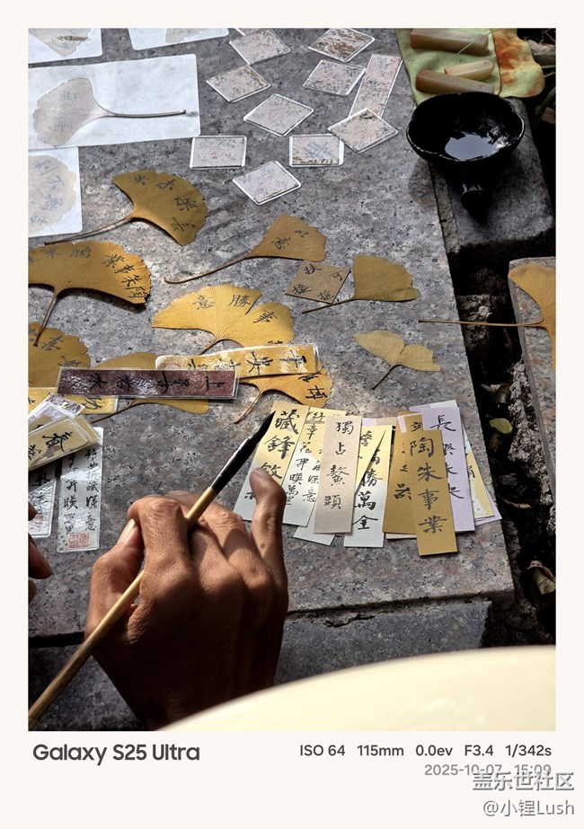 ?? 另外我還拍到了一個(gè)藝人坐在胡同的樹(shù)下,用毛筆在樹(shù)葉上寫(xiě)字、做書(shū)簽的場(chǎng)景——他坐在用瓷磚圍成的小臺(tái)上,周?chē)腥笋v足,生活氣息特別濃。