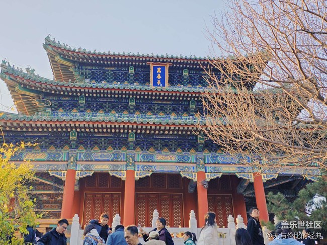 15時 40 分,團(tuán)隊(duì)轉(zhuǎn)場壽皇殿。壽皇殿為清代皇家祭祖重地,九開間重檐廡殿頂,黃琉璃襯以朱柱,威儀赫赫。殿前月臺狹長,常規(guī)視角難以盡收全貌。