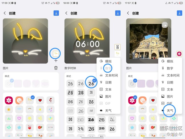 設(shè)置好圖片背景后,我們開始設(shè)置時(shí)鐘的數(shù)字樣式,素材庫有很多藝術(shù)字?jǐn)?shù)字樣式。挑選一個(gè)自己喜歡的放上就可以。然后我們還可以添加天氣的圖標(biāo),同樣有很多選擇,選擇自己喜歡的吧。