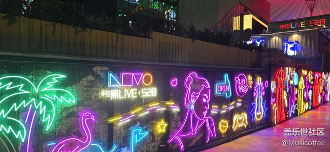 剛走近就被閃到挪不開(kāi)眼——左邊是熒光綠的棕櫚樹(shù) 粉紫色火烈鳥(niǎo)??,像闖進(jìn)了賽博朋克版的熱帶島嶼~ 中間超大的“華熙LIVE·528”霓虹字,藍(lán)紫色光打在墻上,拍照自帶磨皮濾鏡!
