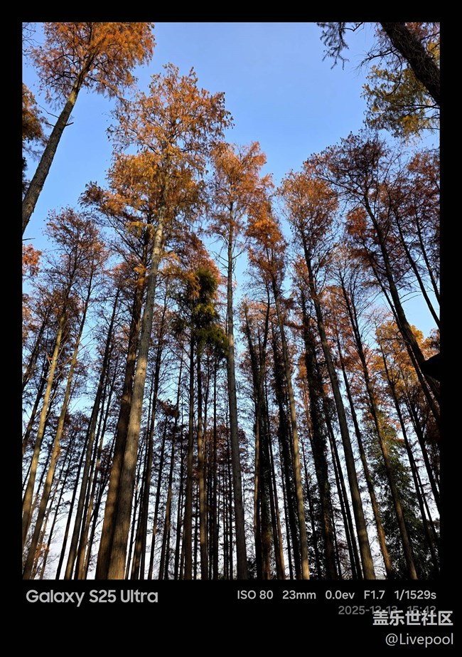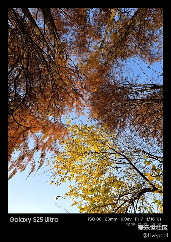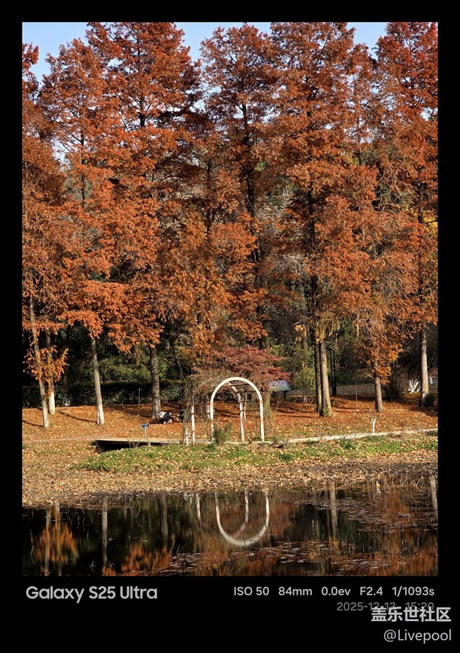 植物園里的落羽杉紅得正是時(shí)候,得益于 S25U 強(qiáng)大的動(dòng)態(tài)范圍,紅色的樹(shù)冠與湛藍(lán)的天空對(duì)比強(qiáng)烈,湖面倒影更是清晰如鏡,直出的色彩就非常有質(zhì)感。