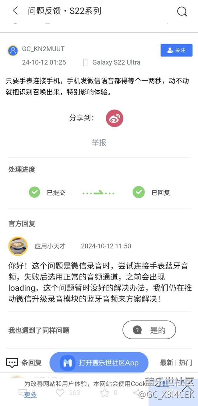24U手機連接三星手表后,微信語音錄音時,總要延遲幾秒。 圖片