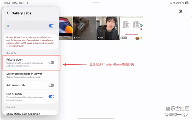 三星平板電腦系統(tǒng)軟件相冊(cè)里有Private album功能的開(kāi)關(guān),但無(wú)Private album相冊(cè)入口,導(dǎo)致導(dǎo)入其中的照片視頻,不管是通過(guò)連接電腦、或者使用系統(tǒng)文件管理軟件或者安全文件夾軟件,都無(wú)法找回。