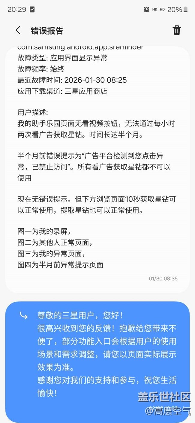 助手樂(lè)園快一個(gè)月不能看廣告領(lǐng)星鉆了,錯(cuò)誤反饋發(fā)了三次,也不給解決問(wèn)題。怎樣能恢復(fù)正常狀態(tài)?
