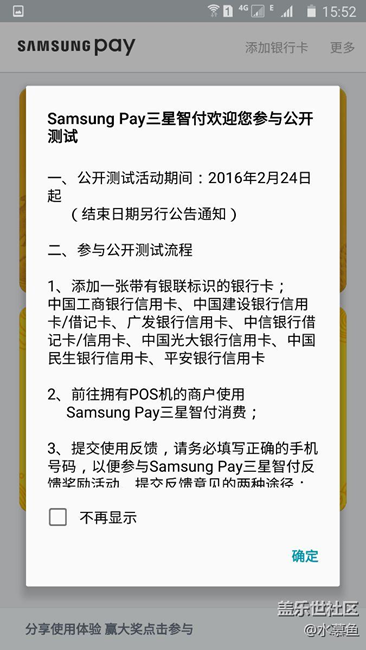 2月24日12點(diǎn),準(zhǔn)時(shí)打開三星支付,提示初始化,結(jié)果15分鐘后還沒有完成,果斷重啟手機(jī)再次進(jìn)入,幾秒鐘就進(jìn)入綁定銀行卡頁面,完成綁定后開始體驗(yàn).....