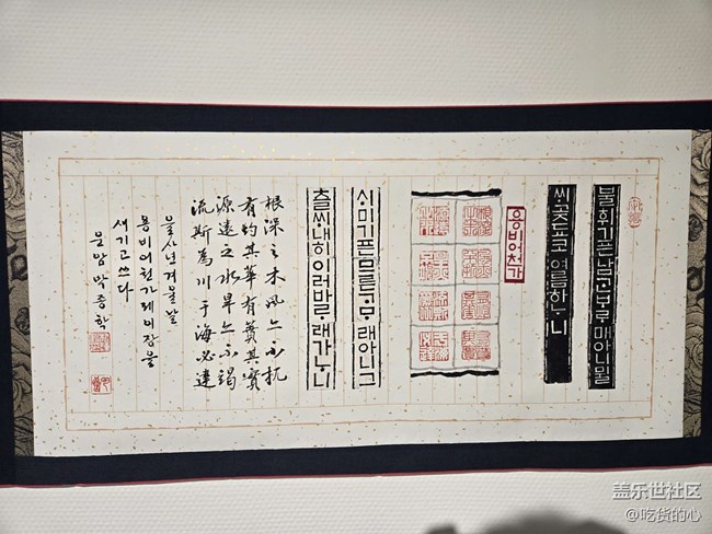 一進韓國文化館,右手邊的展廳正在辦韓國書畫展,挺有意思的!既有韓文書畫,也有漢字作品,一眼就能感受到中韓文化這么多年來的交融與互動,歷史感撲面而來