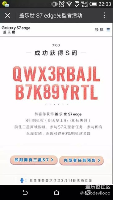 昨晚10點(diǎn)多沒(méi)死心,看到社區(qū)很多小伙伴說(shuō)8點(diǎn)有搶到的,抱著試試的心態(tài)又刷了一次,顯示搶碼成功,但是輸入n遍號(hào)碼依然無(wú)果,估計(jì)試了得有10幾次吧,再次刷碼的時(shí)候直接就跳入了*的狀態(tài),此碼已兌換完畢,就是想告訴大家真正的s碼是何種形式噠,剛才又在官網(wǎng)刷了一次,還是顯示已成功,沒(méi)有搶到的小伙伴們可以再去試試,希望大家可以抽中哦~~~~