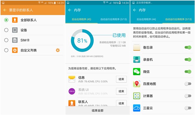 Galaxy S6 edge的Android 5.1.1系統(tǒng)中,在桌面天氣插件里增加了風力大小及方向的顯示;二級菜單內的應用可以按照字幕順序排列了;進入下拉欄的編輯界面,最下方可以設定S搜索以及快速連接的顯示狀態(tài);在編輯壁紙的時候,增加了壁紙運動效果的開關,關閉以后可以起到一定的省電效果;在通話提醒中,增加了電話接聽和結束通話時的振動效果;優(yōu)化內存,一鍵優(yōu)化后不會*進程;計算增加了旋轉按鈕,切換為橫屏時自動更換為科學計算;照相機增加了感光度的設置,可以根據(jù)環(huán)境變化拍攝出更完美的照片。(暫未升級的機友可以對比下,Android 5.1.1還是很值得升級的。)