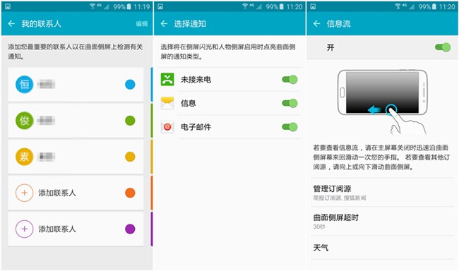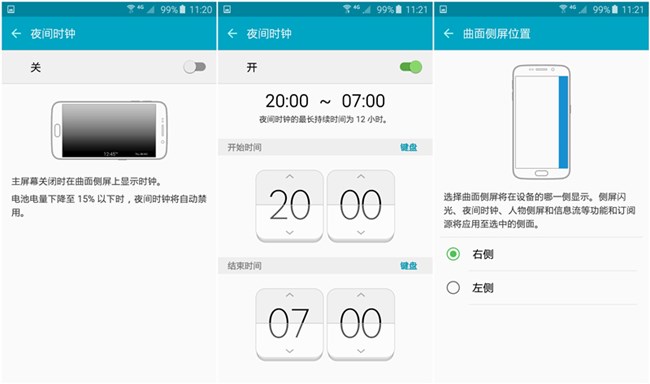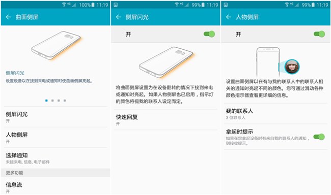 Galaxy S6 edge的曲面屏功能相對于Note edge有所減少,但實用性及可操作性卻有不錯的提高。在設備翻轉的情況下,可以通過側光來了解是否有未接來電或者通知。人物側屏則可以設置5位常用聯(lián)系人,根據(jù)聯(lián)系人不同,在有相關的通知時亮起不同的顏色。Galaxy S6 edge的曲面屏還可以查看信息流,接收訂閱源的消息推送。另一個非常實用的功能則是夜間時鐘的顯示,當然這個時間范圍是可以自己設置的(最長為12個小時)。根據(jù)不同的操作和使用習慣,可以自主選擇曲面屏幕在哪一側顯示,非常人性化。
