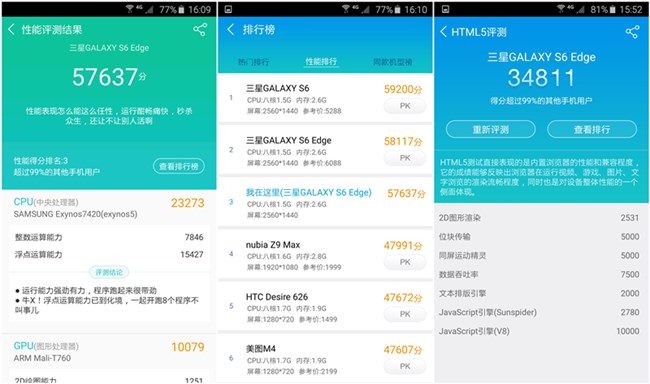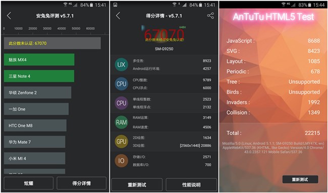 Galaxy S6 edge使用安兔兔5.7.1的64位版本跑分為:67070,HTML5跑分為:22215;使用魯大師7.0.15.0723版跑分為:57637,HTML5跑分為:34811;跑分說明了Galaxy S6 edge配置的強大。