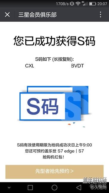 3月5日收到三星會(huì)員俱樂部(微信)和短信通知收到S碼,可以購(gòu)買三星S7Edge手機(jī)。隨后發(fā)現(xiàn)S碼是失效的(自始至終無法使用)。