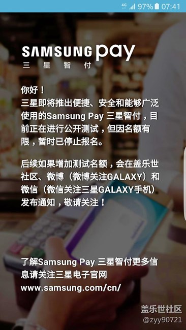 18號到手的S7 edge,打開三星智付是這個情況,不是公測了嗎?為什么還不能使用,大家新到手的三星智付都是這樣嗎?