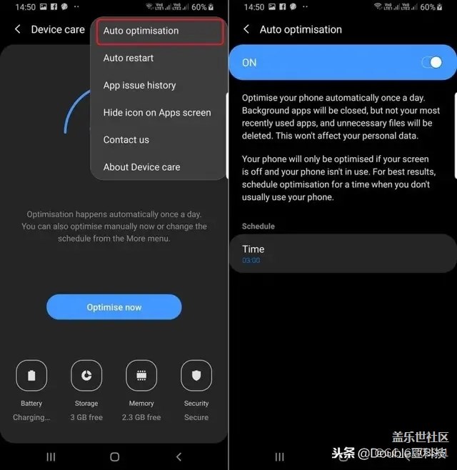可以在Android Pie上的“設(shè)置”--“設(shè)備保養(yǎng)”中找到Auto optimization。在主設(shè)備維護(hù)屏幕中,點(diǎn)擊右上角的三點(diǎn)按鈕,然后點(diǎn)擊Auto optimization(請(qǐng)參閱下面的動(dòng)畫以獲得快速可視指南)。在這里,你可以啟用該功能并選擇進(jìn)行優(yōu)化的時(shí)間。如果在預(yù)定時(shí)間使用手機(jī),則不會(huì)進(jìn)行優(yōu)化,因此請(qǐng)務(wù)必設(shè)置在通常不使用手機(jī)的時(shí)間。