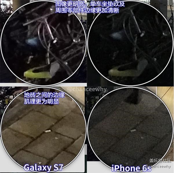 行畫質(zhì)比較,可以看到,左上(S7)圖中畫面更明亮,單車的坐墊以及周圍零部件邊緣