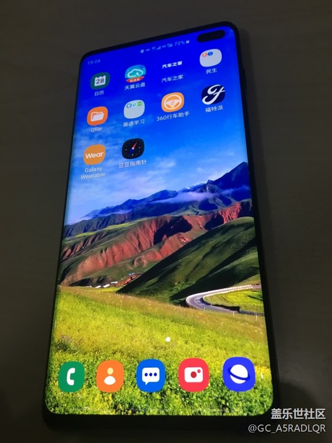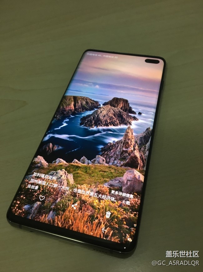 開機后畫面,6.4寸屏,上下邊框很窄,屏幕素質(zhì)沒得說,絕對業(yè)界一流,超聲波指紋識別也OK,取消了虹膜,保留了人臉識別,試了一下也很快。和S9系列845芯片一樣,S10的855也可以使用二張電信卡,不過我是都開了volte的,唯一覺得遺憾的還是攝像頭開孔,還好開孔不像A8s那么大,前置也帶背景虛化,其實前攝像頭對我來說沒有任何用處,不要也可以。兩邊揚聲器發(fā)聲,杜比環(huán)繞音效加持,聽感還是非常不錯的。