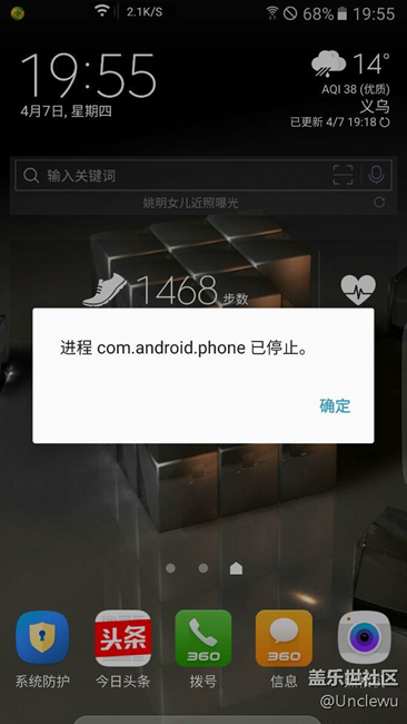 以前沒遇到過,今天更新了My KNOX,在My KNOX使用微信中突然彈出進程com.android.phone已停止,點確定后3秒又彈出