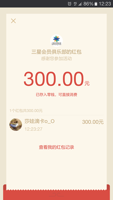 如題,今天打開微信時提示可領取返現(xiàn)紅包,真是開心。三星終于兌現(xiàn)了。我是第幾個領到的?