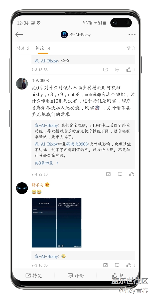 想要期待程序員加入揚(yáng)聲器播放時可喚醒Bixby功能的小伙伴們可以死心了,官方回復(fù)是:s10硬件上增強(qiáng)了外放功能,導(dǎo)致播放音樂時麥克收音性能下降,語音喚醒率降低,無奈去掉了。已經(jīng)是Bixby產(chǎn)品經(jīng)理確認(rèn)的事了,所以洗洗睡吧,圖一為note9截圖,圖二為S10 截圖