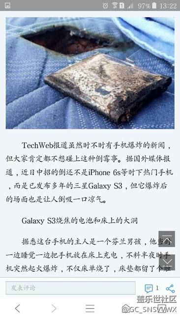 三星Galaxy S3充電時爆炸:床墊燒了個“巨坑” 圖片