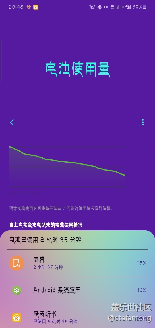 。。。中度使用(看了一小時電影)一小時游戲直播,之后全程在兜里,聽歌3小時,半天(12點到21點30)耗電70%,我真的服了。什么功耗?最絕的是,明明剩30%的電了,電池使用情況耗電量加起來是58%。
