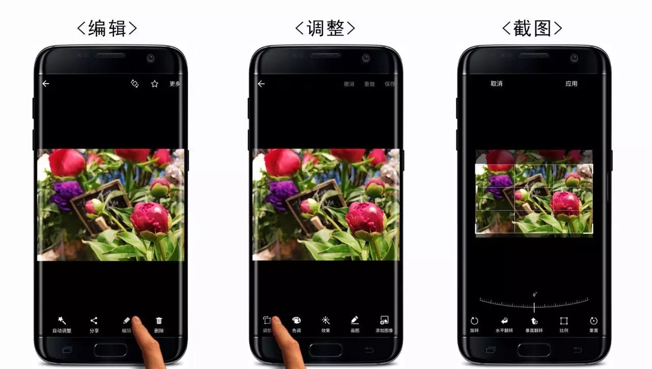 拍完照片后,打開蓋樂世 S7 edge | S7 相冊,找到剛剛拍攝的照片,點擊編輯、調(diào)整、裁剪成喜歡的構圖即可。