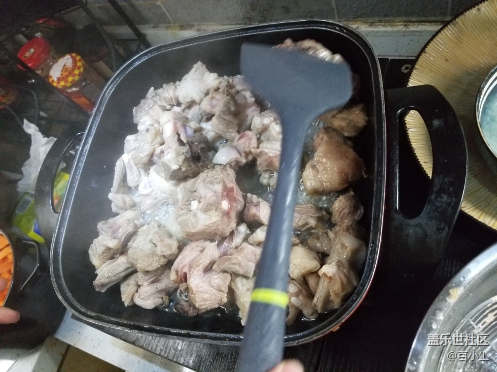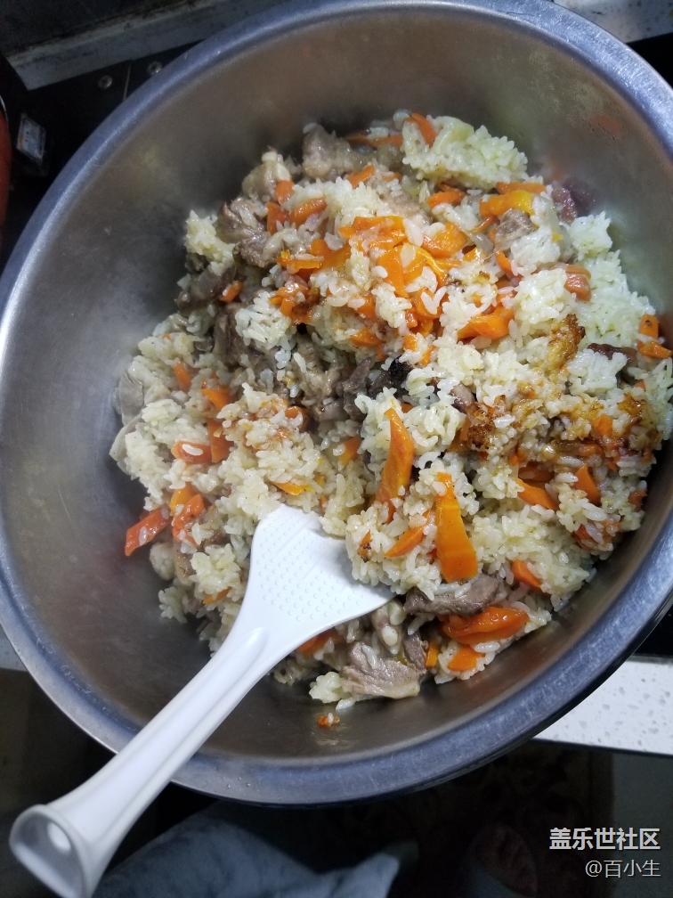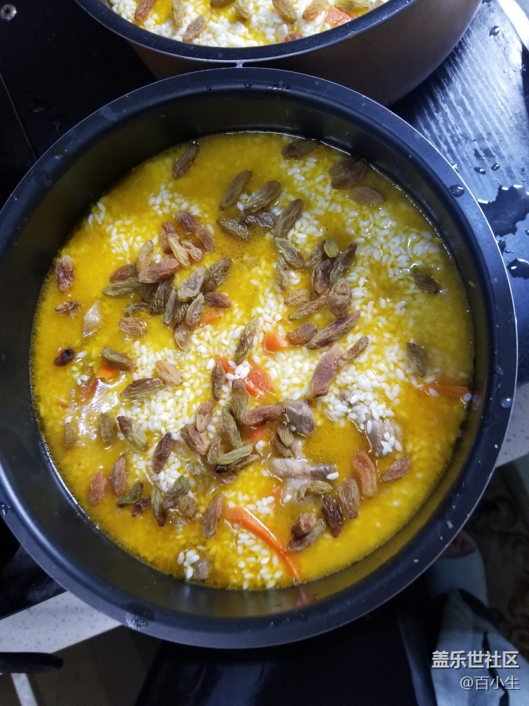 四,忘記說了,需要提前把米飯泡好,喜歡軟的就多泡一會(huì)一小時(shí),硬的泡半小時(shí),然后鋪到放羊肉的鍋里,