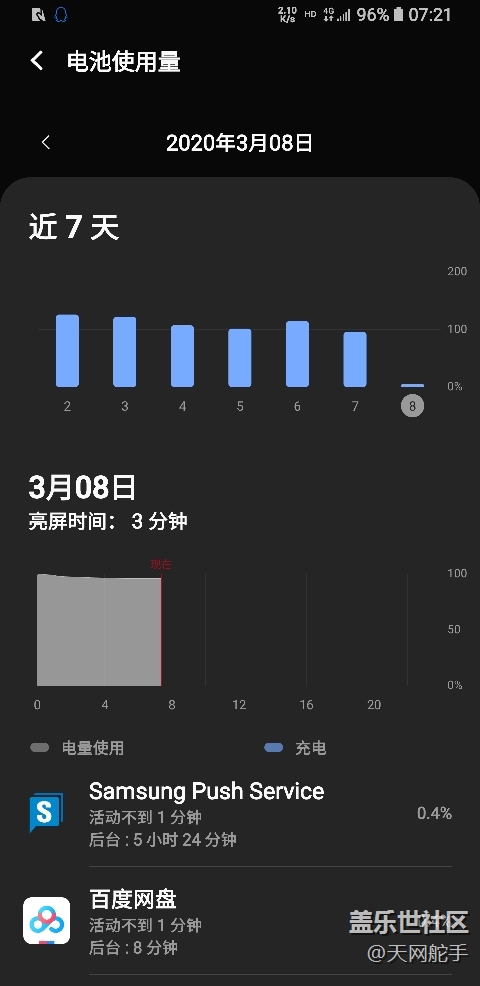 晚上12點30至早上7點21分。 電池從百分之98到百分之96。7小時掉電百分之2。國行機的安卓10,待機給力。