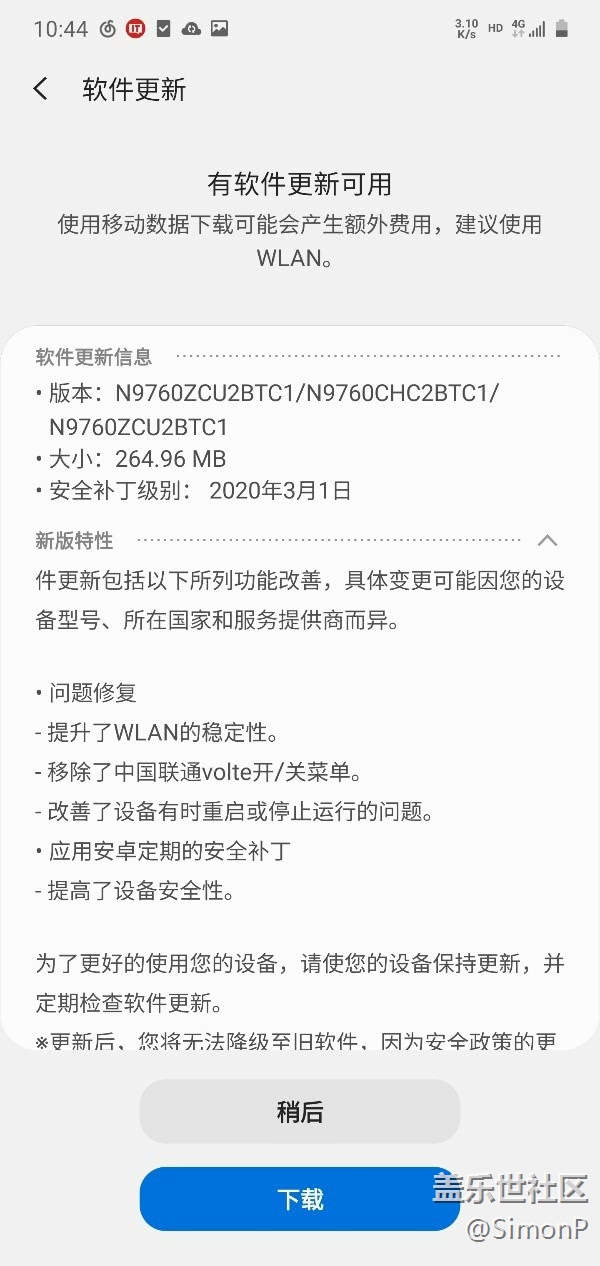 三星Galaxy Note 10 5G現(xiàn)已推送系統(tǒng)更新,更新至2020年3月1日安全補(bǔ)丁級別,提升了WLAN的穩(wěn)定性,移除了中國聯(lián)通VoLTE開/關(guān)菜單,并改善了設(shè)備有時重啟或停止運行的問題。