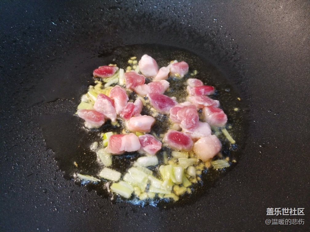 鍋中下油,加蔥姜沫炒出香味,加五花肉丁