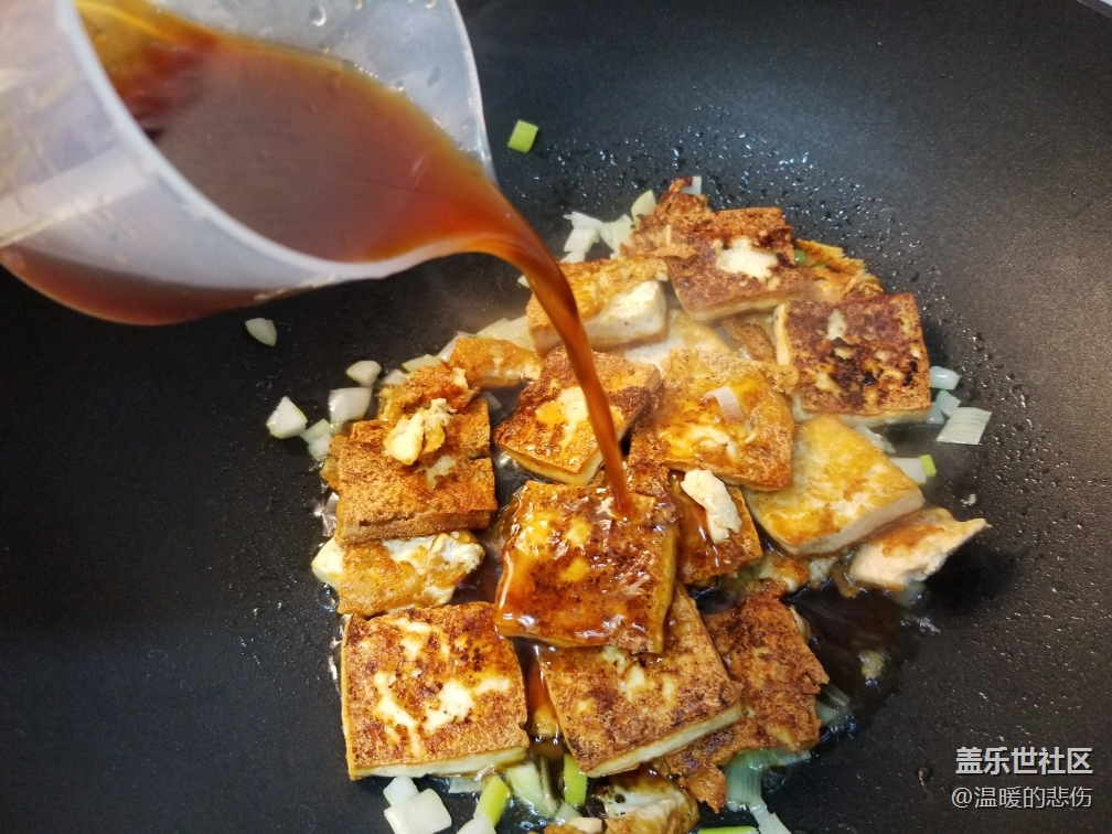 鍋中下油加蔥沫炒出香味,加入煎好的豆腐