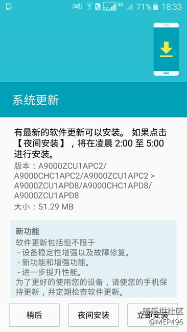 收到更新了,可惜很遺憾  并沒(méi)有samsung pay或者6.0 但是這個(gè)更新應(yīng)該是為SP做的鋪墊,原因是什么自己去論壇找