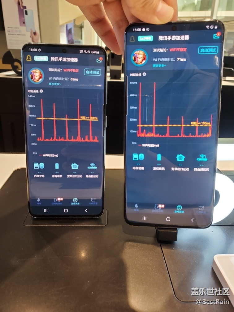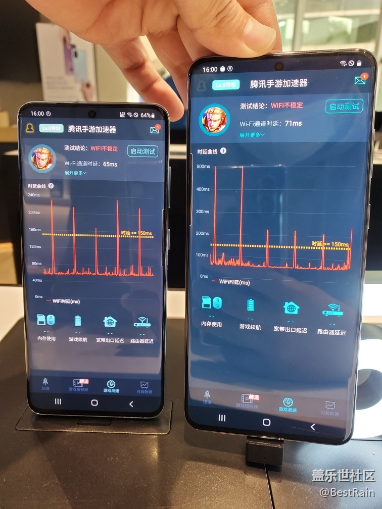 懷著探知真理的心,也是對三星執(zhí)著,確實(shí)喜歡三星屏幕,三星界面,但一如既往這種簡單毛病煩多了,只有轉(zhuǎn)到華為或者割肉轉(zhuǎn)蘋果了,無奈。言歸正傳,今天到朋友的三星店進(jìn)行了一輪測試,機(jī)型為note10 ,s20,s20 ,5G頻段WiFi完全正常,但是2.4G(稱之為穿墻頻段,也是老WiFi路由器常用頻段)全部斷流,也就是延時(shí),下載文件感覺不出來,但是游戲時(shí)候會(huì)有ms也就是ping值顯示,以及實(shí)時(shí)反饋,所以大家會(huì)有感受。測試工具為騰訊手游加速器。
