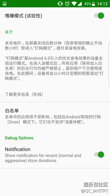 舊方案樓主更新系統(tǒng)后發(fā)現(xiàn)失效了,已經(jīng)無法再?gòu)?qiáng)制打開Doze模式,現(xiàn)提供新的方法: