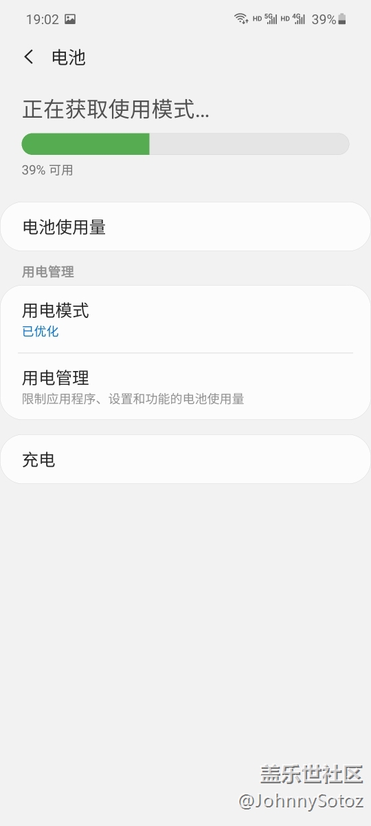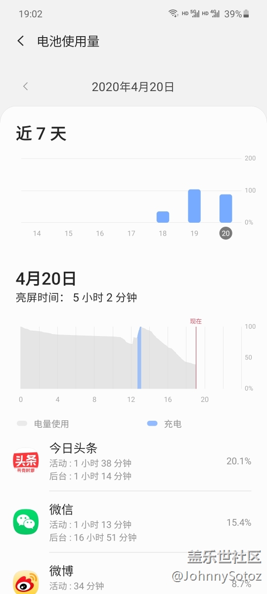 來(lái)說(shuō)下三星Galaxy A71 5G的續(xù)航表現(xiàn)吧,今天一天下來(lái)到現(xiàn)在手機(jī)亮屏了5個(gè)小時(shí),我沒(méi)有玩游戲,一直用5G網(wǎng)絡(luò)在和你們刷頭條和微博互動(dòng),用手機(jī)拍了很多相片上傳分享,手機(jī)一直鏈接著我的Galaxy active2手表和Galaxy Buds 耳機(jī)在聽(tīng)喜馬拉雅,回到家才斷開(kāi)藍(lán)牙打開(kāi)WIFI,現(xiàn)在還有百分之39的電,這個(gè)續(xù)航相當(dāng)不錯(cuò)的,中高強(qiáng)度用一天沒(méi)有問(wèn)題。而且現(xiàn)在還不是最好的狀態(tài),等7天手機(jī)ai學(xué)習(xí)了你的使用模式后會(huì)更省電。
