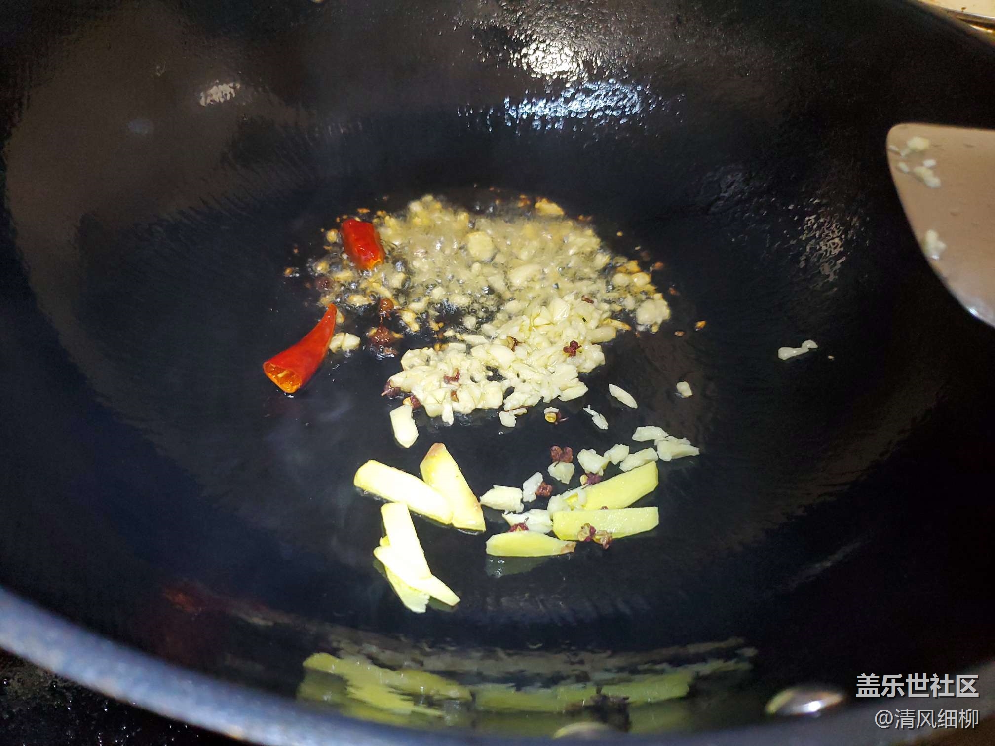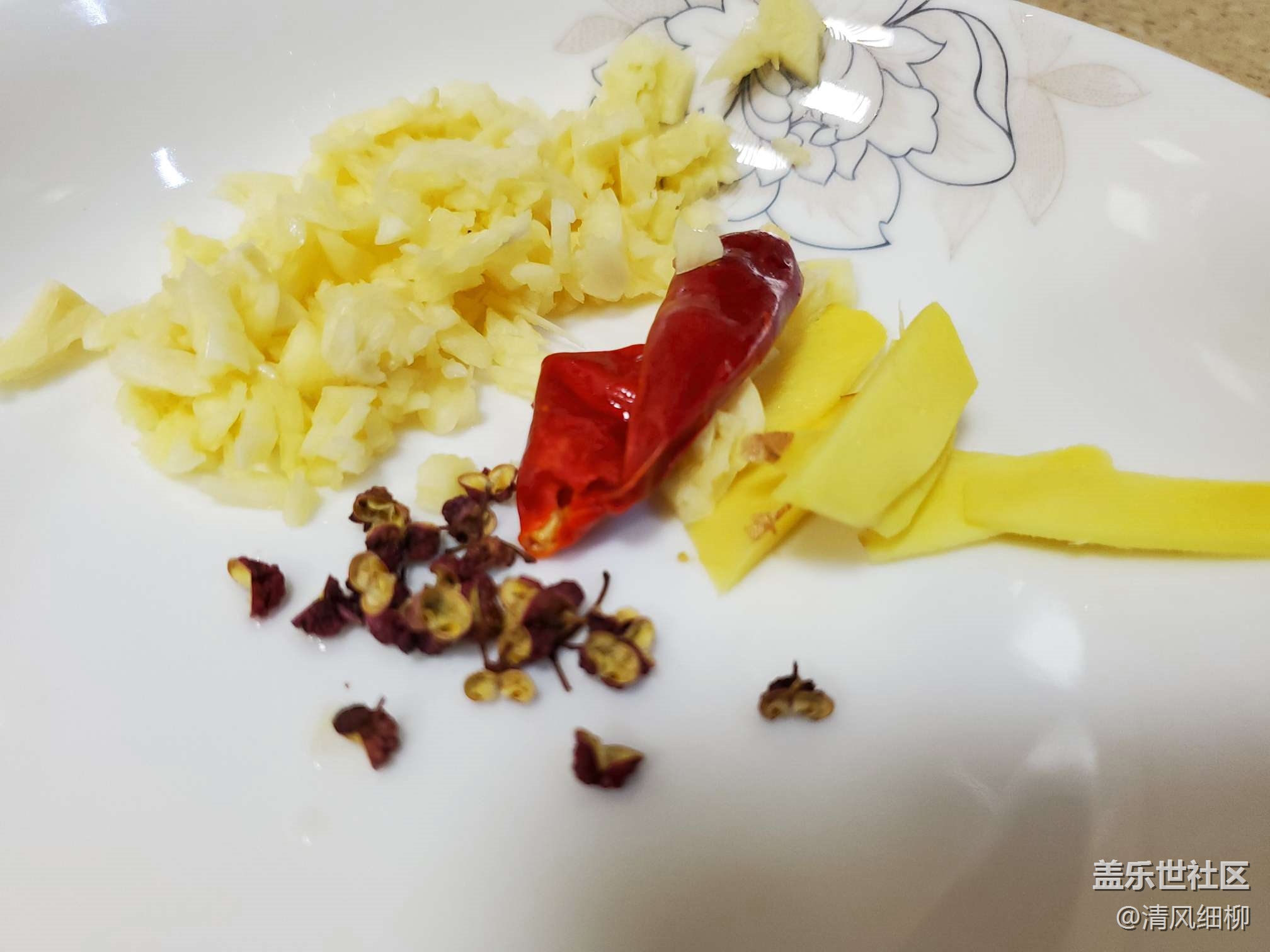 4、準備幾片姜片、大蔥片、干辣椒兩個(可以切成絲,也可以不切)、花椒五六粒、三瓣大蒜拍成粒。