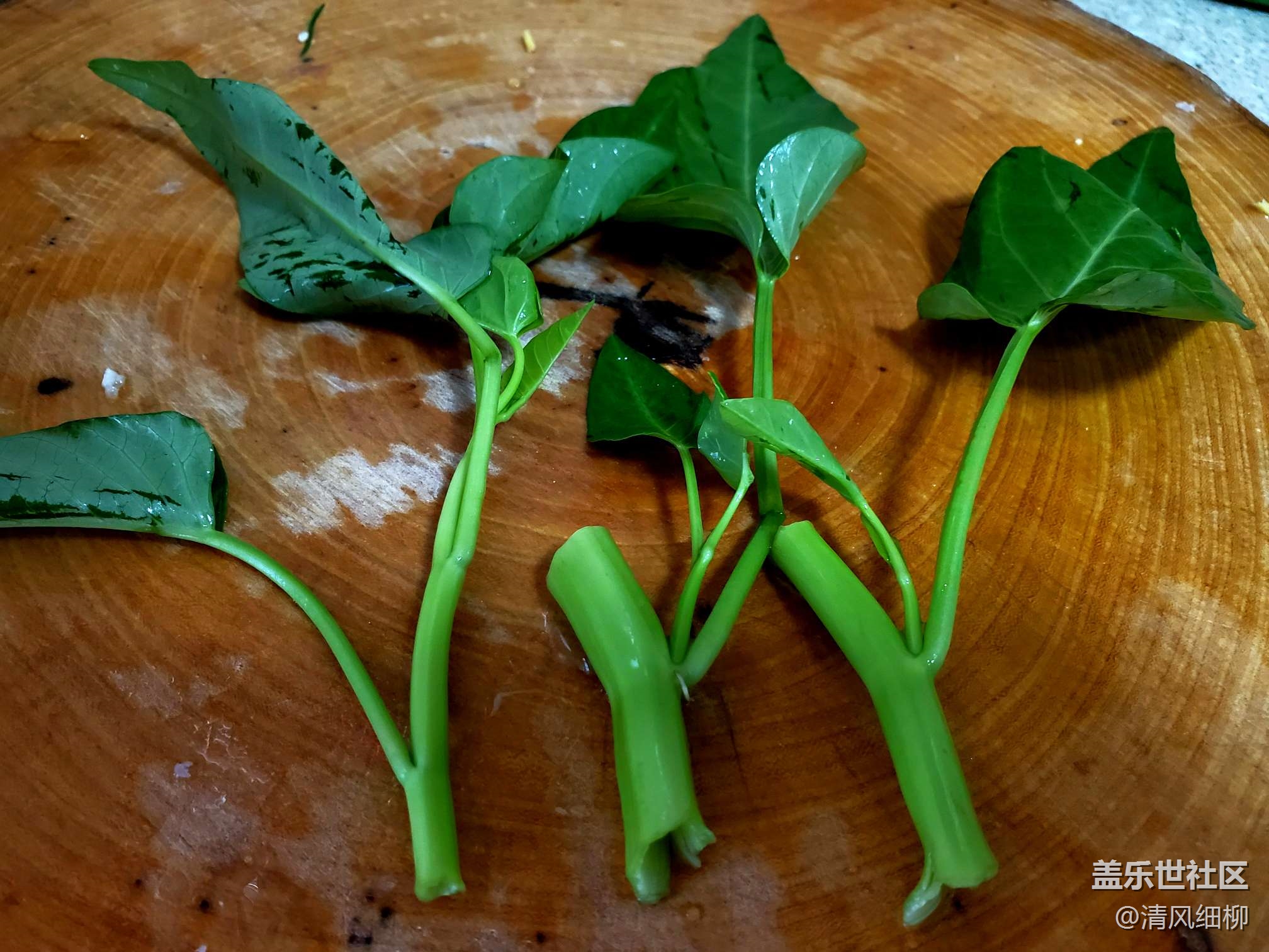 2、去掉老葉黃葉,掐去老梗,掐成一葉一節(jié)。最好別用刀切,破壞葉子的整體性。