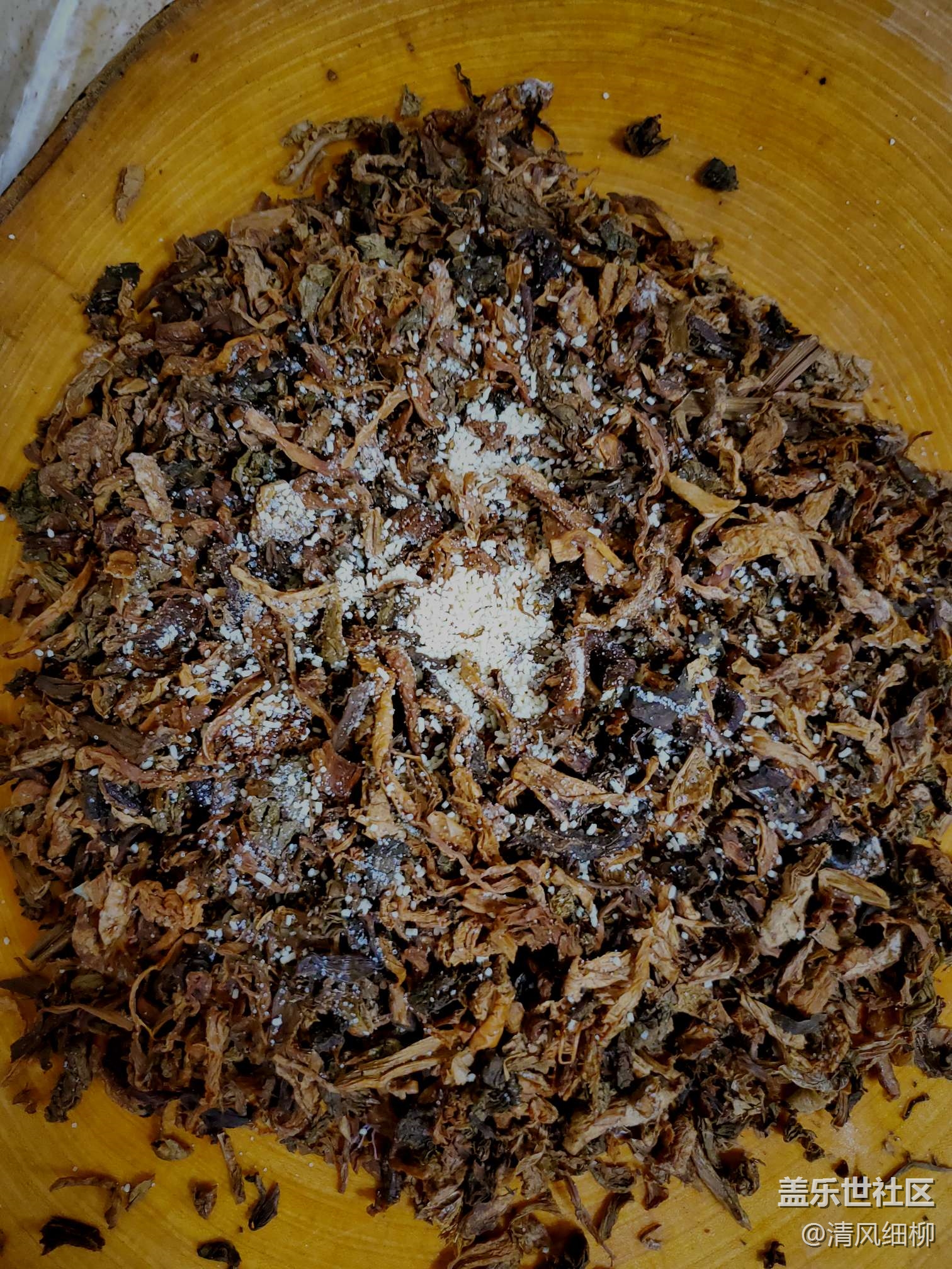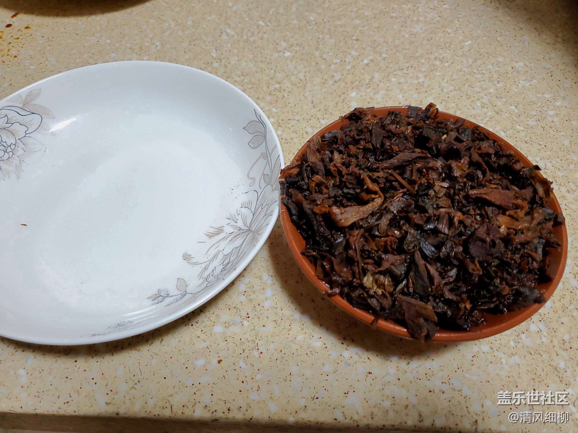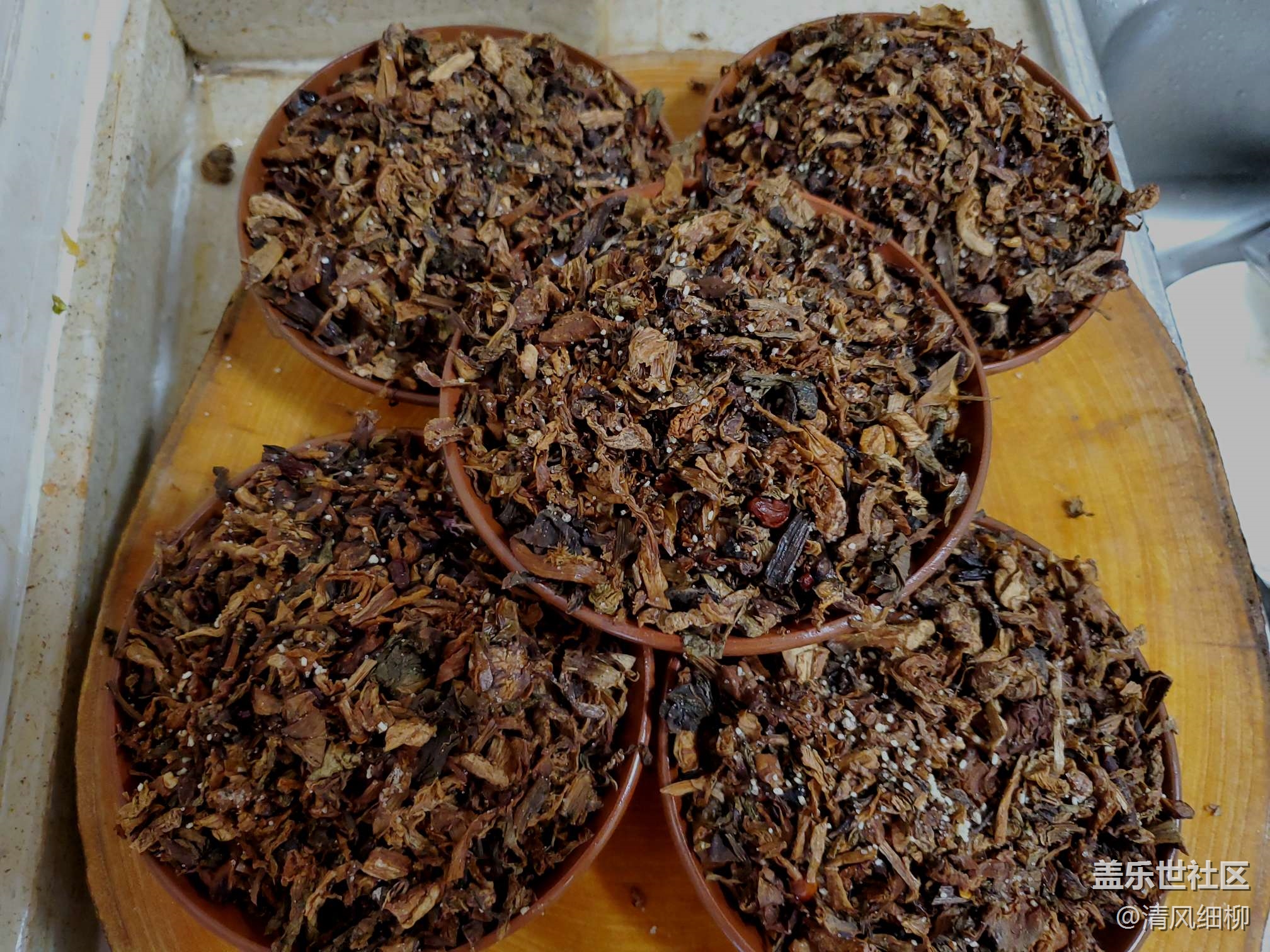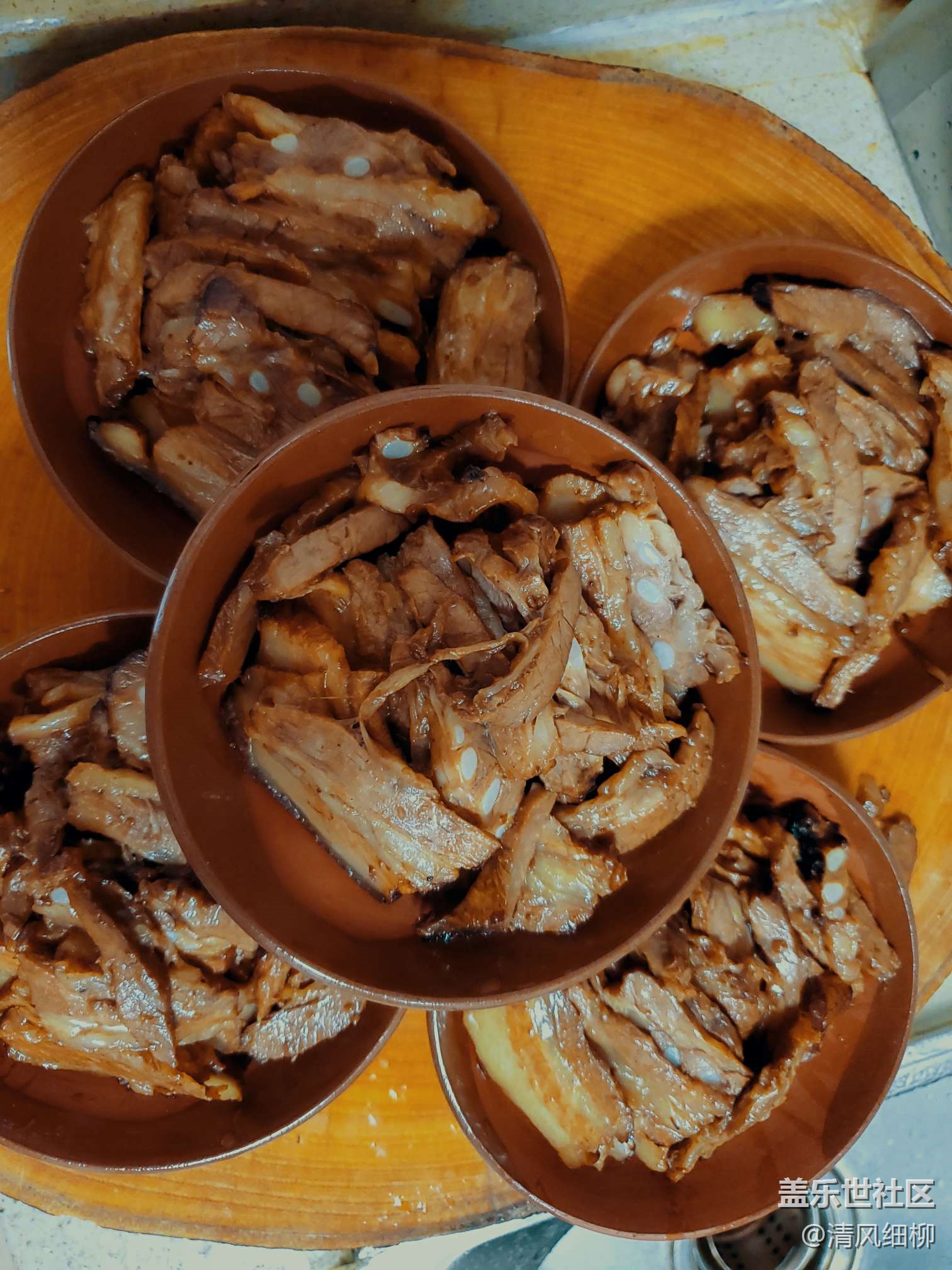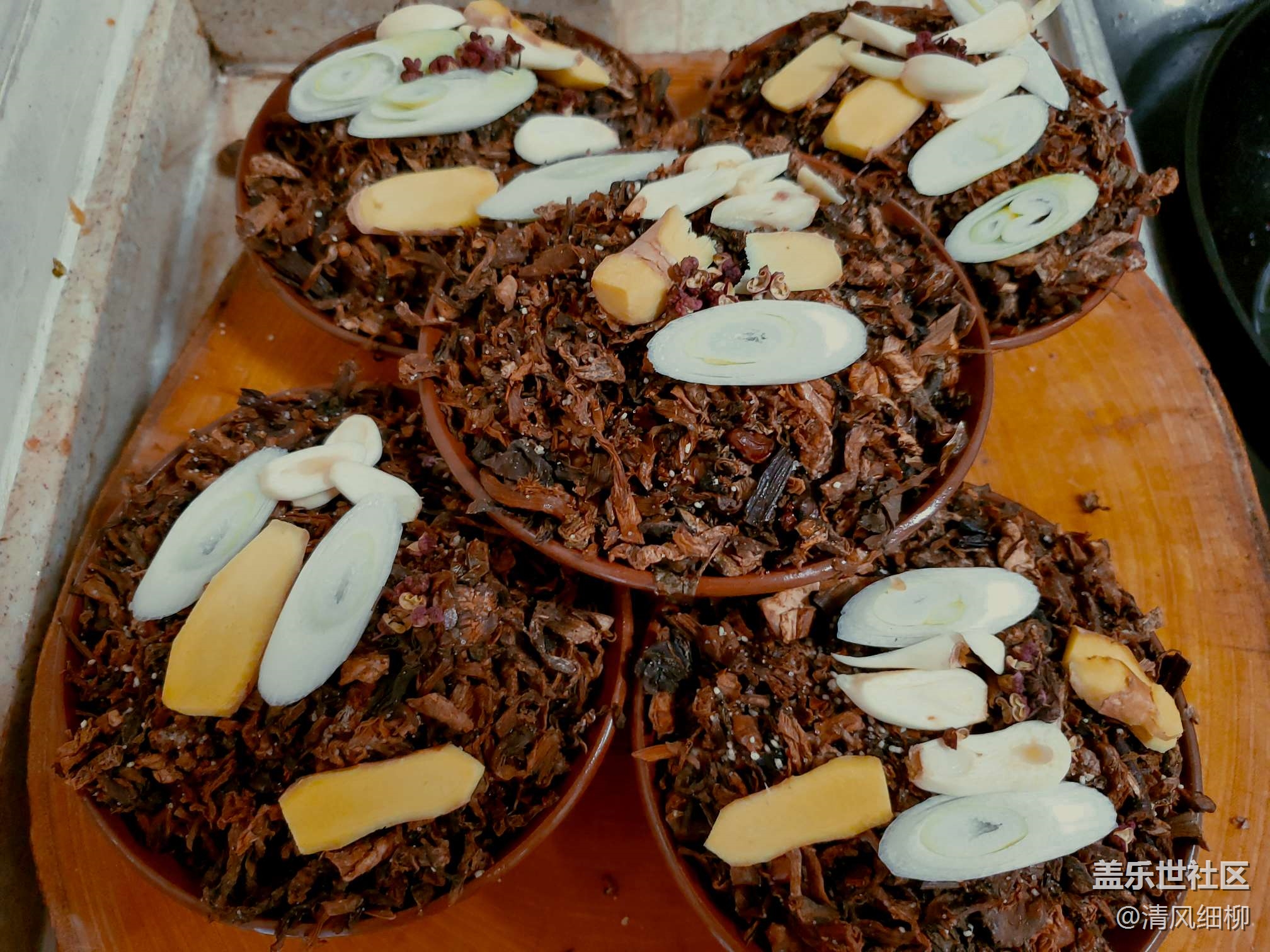 取紅土碗幾個(也可以用盤子、其他碗,但是紅土碗滲透性好不容易積水,市場上買得到就看你的運氣了),依次將拌好的五花肉片皮朝下貼碗底擺好,紅土碗以十片為佳,剩余空隙把肉的邊角余料加入,然后在肉片上均勻放上配好的鹽菜,最后上面放點大蔥、姜片、幾顆花椒。