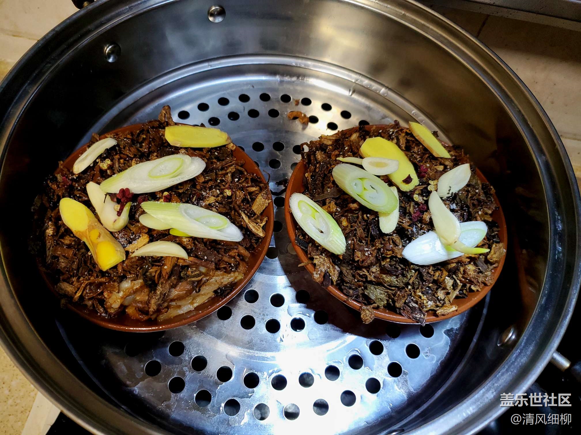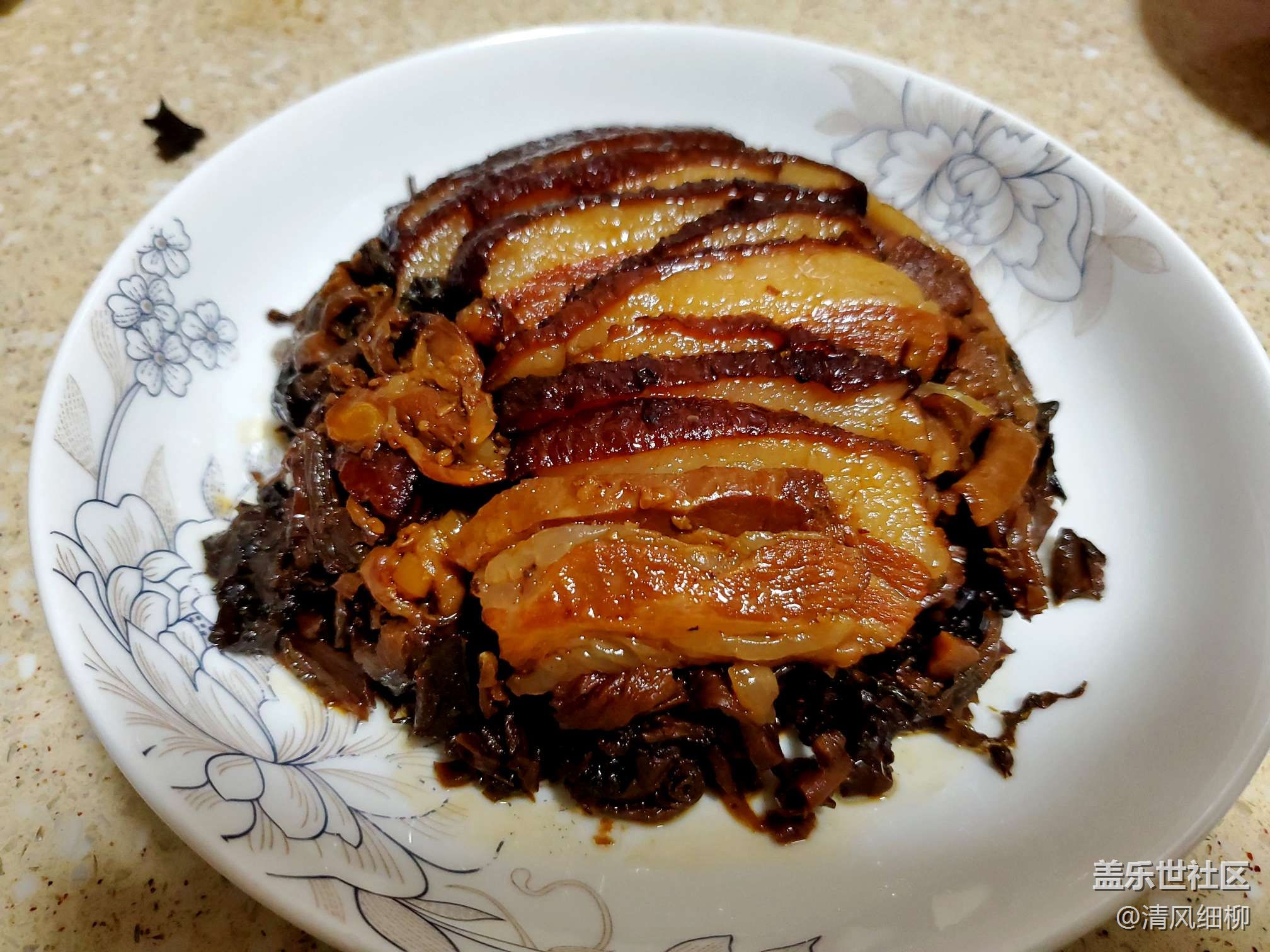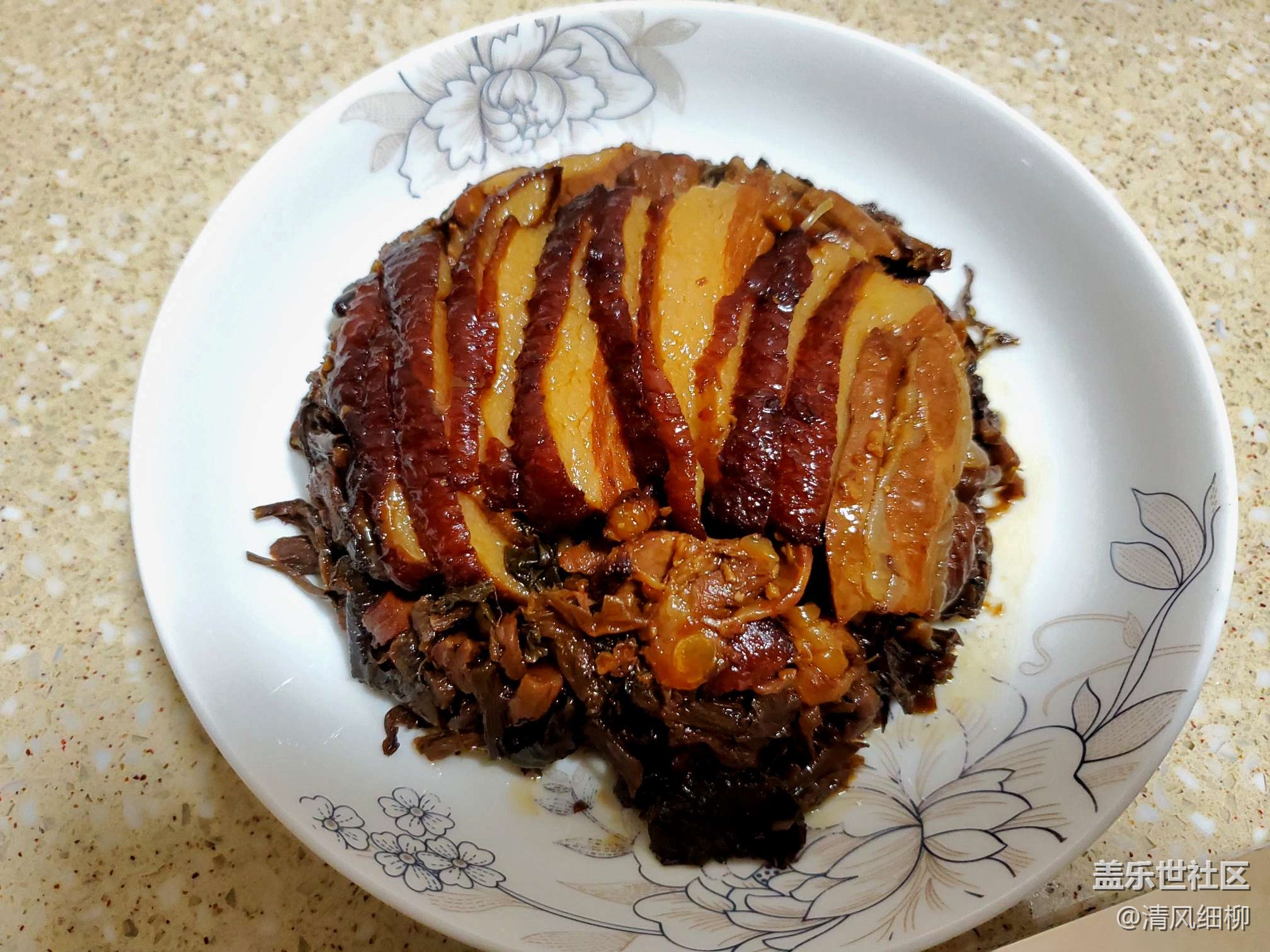 蒸鍋把水加到最高限,把蒸碗放入蒸格加蓋、開火,大火燒開二十分鐘后轉(zhuǎn)中火十分鐘,然后轉(zhuǎn)最小火(這時候已經(jīng)熟了,但還不沒有達(dá)到蒸出脂肪和化渣的效果,可以嘗一片鹽味,不夠可以直接在鹽菜上再撒點鹽),小火三十分鐘后關(guān)火不開蓋,悶三十分鐘,大功告成!