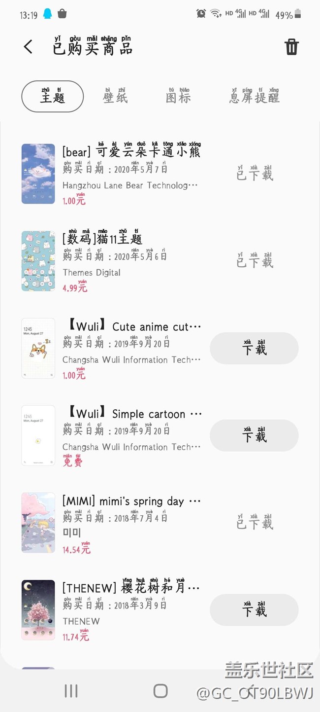 主題商店里面的已購買只顯示主題壁紙圖標和息屏提醒。