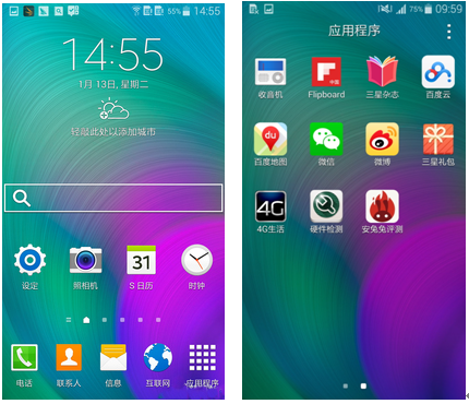 三星GALAXY A7搭載的是基于Android4.4.4的Touchwiz界面,UI風(fēng)格很沿襲了2014年推出的旗艦手機(jī)的風(fēng)格,再搭配上GALAXY A7的超炫大屏,真是美極了,當(dāng)然,體驗(yàn)也必須是棒棒的。